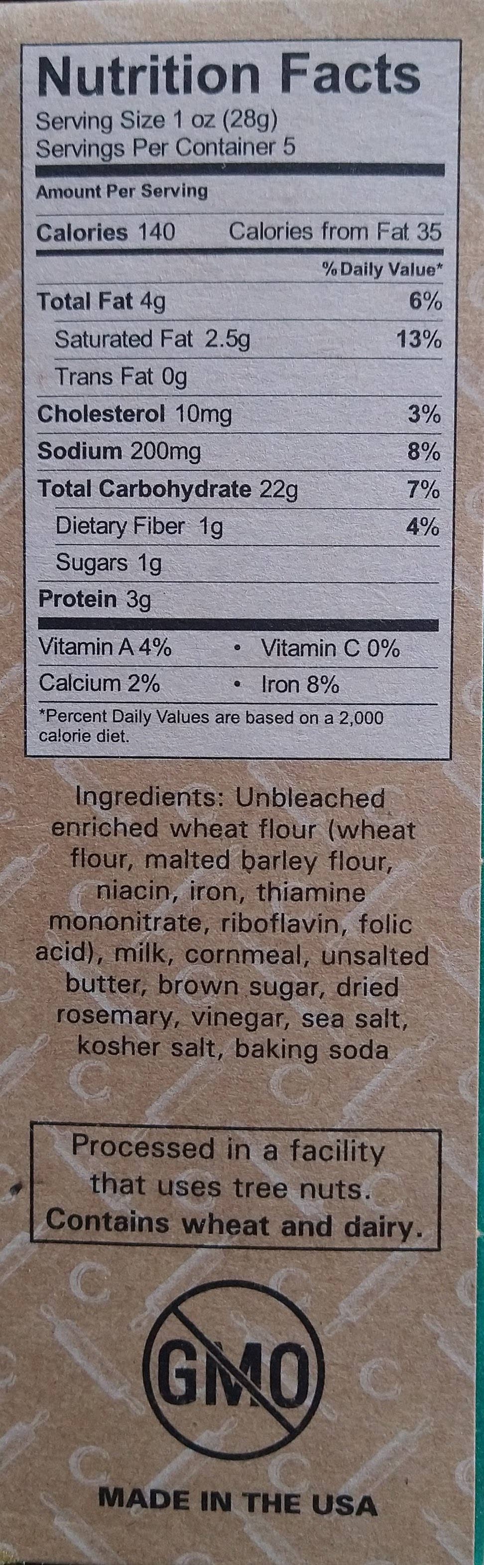 Unbleached enriched wheat flour (wheat flour, malted barley flour, niacin, reduced iron, thiamine mononitrate, riboflavin, folic acid), yellow cornmeal, buttermilk, unsalted butter, Vermont maple syrup, dried rosemary, sea salt, baking soda, kosher salt. Processed in a facility that uses tree nuts; Contains wheat and dairy.